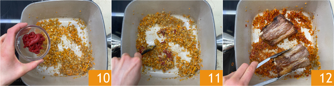 Quando o refogado estiver macio, adicione o extrato de tomate 10 e toste por alguns minutos 11, depois coloque as costelas de boi de volta na panela 12.