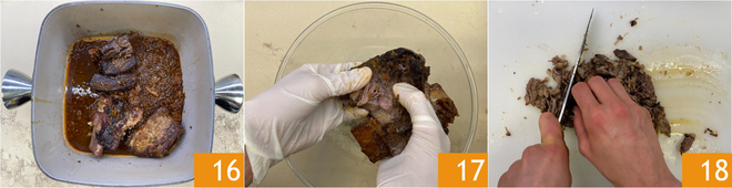 Ao término do tempo de cozimento, deixe a carne esfriar um pouco dentro da panela 16. Desfie a carne com as mãos, removendo os ossos e as cartilagens 17, depois pique com uma faca 18 e transfira para uma tigela.