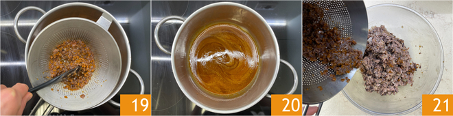 Coe o fundo de cozimento em uma panelinha 19 e reduza em fogo baixo por cerca de 20 minutos 20 até reduzir pela metade. Enquanto isso, adicione o refogado restante no coador à carne na tigela 21.