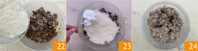 Adicione o Parmigiano Reggiano ralado 22 e o mascarpone 23. Misture bem para incorporar tudo 24, transfira para um saco de confeitar sem bico e reserve na geladeira.