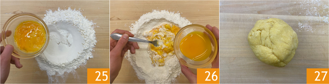 Coloque a farinha em forma de montinho na superfície de trabalho, depois despeje no centro os ovos 25 e as gemas 26. Incorpore a farinha mexendo primeiro com um garfo, depois continue trabalhando na superfície de trabalho até obter uma massa lisa e homogênea 27. Envolva o bloco em filme plástico e deixe descansar em temperatura ambiente por 30 minutos.