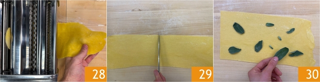 Divida o bloco em 2 porções e estenda a primeira parte da massa com a ajuda de uma máquina de macarrão 28, cuidando para manter a segunda porção coberta; você deve obter folhas com espessura de 1 a 2 mm. Corte as folhas ao meio e coloque as folhas de sálvia sobre uma delas 30.