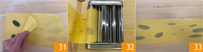 Cubra com a outra metade da folha 31 e passe novamente tudo na máquina de macarrão 32 para que adira bem: você obteve assim folhas laminadas com sálvia 33. Estenda também a segunda porção de massa para obter folhas da mesma espessura, mas neste caso não adicione sálvia: serão a base dos raviolis.