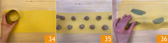 Pegue uma folha de massa não laminada e pressione levemente com um cortador de 7,5 cm de diâmetro para marcar o contorno de cerca de 40 raviolis 34. Aperte um generoso montinho de recheio no centro de cada disco 35, depois polvilhe com um pouco de água e cubra com a folha laminada 36.
