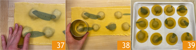 Pressione bem com os dedos para expulsar todo o ar 37; se necessário, você pode fazer um furinho na folha com um palito de dente para eliminar o ar restante e depois selá-lo novamente. Finalmente, corte os raviolis com o mesmo cortador usado anteriormente 38. Coloque os raviolis em uma bandeja 39 e coloque-os no congelador por pelo menos 2 horas; assim, eles manterão melhor a forma durante o cozimento.