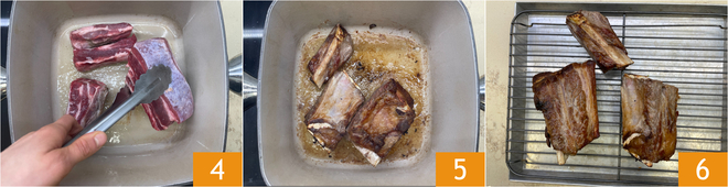 Pegue uma panela de ferro fundido e aqueça bem com um pouco de óleo de sementes, depois coloque as costelas e sele de todos os lados, tocando o mínimo possível 4. Quando a carne estiver bem dourada 5, transfira para uma grade 6 e deixe o fundo de cozimento na panela.