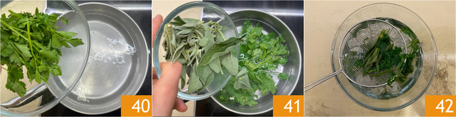 Leve uma panela com água para ferver e branqueie por um minuto a salsinha 40 e a sálvia 41. Transfira as ervas aromáticas para água com gelo para interromper o cozimento e fixar a cor 42.
