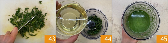 Escorra bem o excesso de água e pique grosseiramente com uma faca 43. Coloque as ervas em um liquidificador, adicione o óleo de sementes 44 e bata para obter uma mistura homogênea 45.