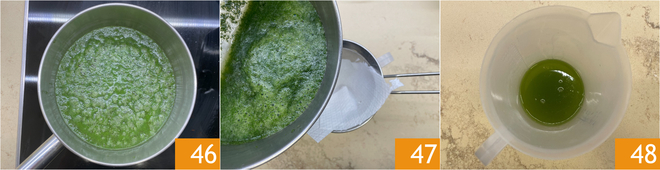 Despeje a mistura em uma panelinha e deixe ferver por 30 segundos 46, depois coe com uma peneira forrada com um pano ou gaze 47. Deixe o óleo obtido descansar por 30 minutos 48, eliminando as impurezas e reservando a parte restante.