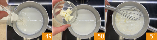 Aqueça o leite e o creme de leite em uma panelinha em fogo alto 49, depois adicione a manteiga 50 e mexa para derreter 51.