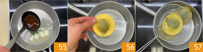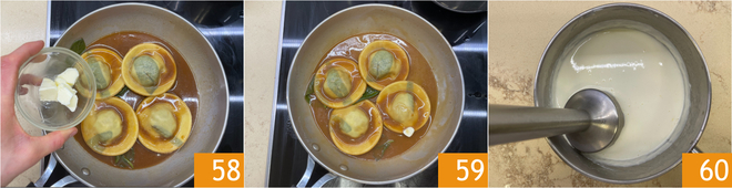 Retome o fundo de cozimento reduzido e despeje em uma frigideira com uma parte da manteiga 55, depois derreta suavemente. Enquanto isso, mergulhe os raviolis congelados na água fervente com sal, certificando-se de que não ferva muito vigorosamente para evitar que abram 56. Cozinhe os raviolis por cerca de 5 minutos, depois escorra e transfira para a frigideira com o molho 57.