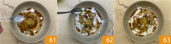 Sirva o ravioli com o seu molho, depois complete com a espuma de limão 61 e o óleo verde 62. O ravioli recheado de costelas de boi com espuma de limão está pronto para ser servido 63!