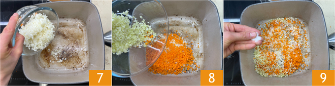 Adicione ao fundo de cozimento a cebola 7, as cenouras e o aipo picados bem finamente 8, depois salgue 9 e deixe refogar suavemente por cerca de dez minutos, mexendo sempre.