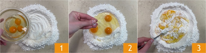 Para preparar os raviolis recheados com frango caipira, a primeira coisa a fazer é dispor a farinha em uma superfície e colocar os ovos no centro 1. Adicione uma pitada de sal 2 e incorpore gradualmente a farinha com um garfo 3.