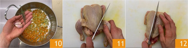 Adicione também dois dentes de alho amassados com a casca e um ramo de tomilho e alecrim 10. Refogue em fogo baixo por 5 minutos ou até que os legumes estejam macios. Enquanto isso, corte o frango caipira em pedaços 11 12.
