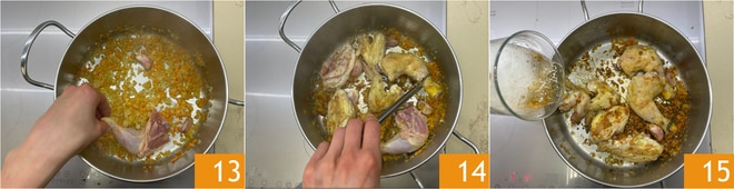Adicione os pedaços de frango na panela 13 e doure todos os lados até ficarem dourados 14. Despeje a cerveja na panela 15.
