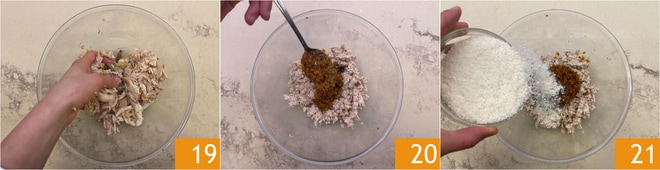 Retire a carne da panela e deixe esfriar um pouco. Em seguida, desfie a carne 19, eliminando a pele e os ossos, e transfira para uma tigela. Adicione o caldo de cozimento, os legumes 20 e o Parmesão 21.