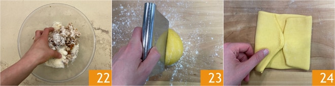 Misture 22 até obter um composto homogêneo. Deixe esfriar completamente e coloque tudo em um saco de confeiteiro. Pegue a massa e divida-a ao meio 23. Abra as folhas com uma máquina de macarrão. Comece com a espessura maior, depois dobre as extremidades da folha em direção ao centro 24. Passe novamente pelos rolos, diminuindo gradualmente a espessura.