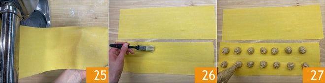 Continue assim até obter 2 folhas com espessura de 2-3 mm 25. Pincele uma folha com água 26 e coloque montinhos de recheio, a uma distância de 3-4 cm um do outro 27.