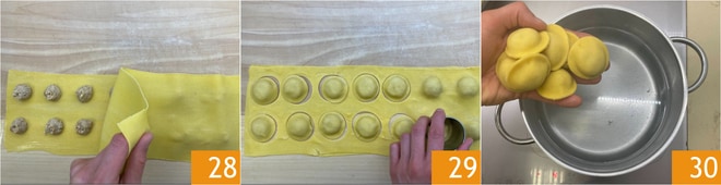 Coloque a segunda folha por cima 28. Tente eliminar o ar em torno do recheio e faça as duas folhas aderirem bem, dessa forma, os raviolis não se abrirão durante o cozimento. Com um cortador de massas, dê forma aos seus raviolis 29. Cozinhe-os em água fervente com sal por 3-4 minutos 30, até que subam à superfície.