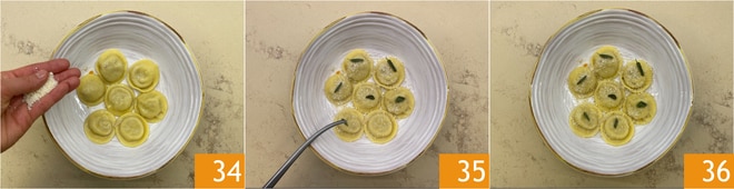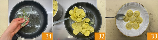 Enquanto isso, em uma frigideira, derreta a manteiga, adicione as folhas de sálvia 31. Escorra os raviolis e transfira-os para a frigideira 32, salteie delicadamente por alguns minutos. Emprate e adicione a manteiga derretida 33.