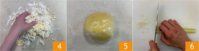 Depois, amasse com as mãos 4 até obter uma massa lisa e homogênea. Envolva em filme plástico 5 e deixe descansar em um local fresco e seco por pelo menos 30 minutos. Enquanto isso, corte o aipo em pequenos cubos 6.