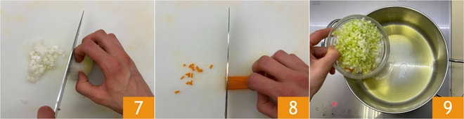 Corte também a cebola 7 e as cenouras 8 finamente. Em uma panela, despeje um fio de azeite e adicione os legumes 9.