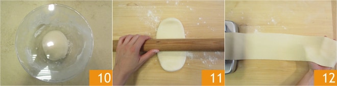 Forme uma massa homogênea, cubra com filme plástico e deixe descansar por 30 minutos 10. Estenda a massa primeiro com o rolo 11, depois passe na máquina de massa 12 para criar uma folha bem fina.