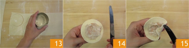 Recorte círculos com um copo ou um cortador de biscoitos de 8 cm de diâmetro 13. Coloque uma colher de recheio no centro do disco de massa 14. Dobre as bordas com a ponta de uma faca 15.