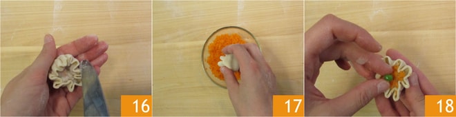 De modo que lembrem uma flor 16. Guarneça a superfície mergulhando a parte superior do ravioli em uma tigela com cenouras raladas 17. Insira no centro uma ervilha 18.
