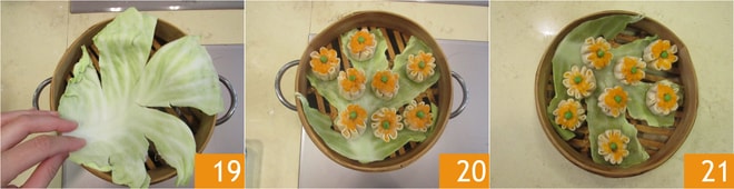 Pegue uma cesta para cozimento a vapor, coloque uma folha de repolho por cima para não grudar os raviolis 19. Insira os raviolis 20, cubra com a tampa e cozinhe por 10-12 minutos em fogo médio. Os raviolis Shao Mai estão prontos para serem saboreados 21.