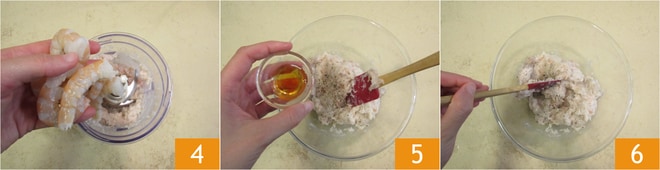 Adicione também os camarões e bata finamente para obter uma mistura homogênea 4. Transfira o recheio para uma tigela e tempere com sal, pimenta e vinho de arroz 5. Misture e deixe descansar por 10 minutos 6.