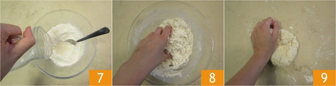 Cuide da massa: em uma tigela, coloque a farinha, a água morna no centro e uma pitada de sal 7, misture 8 e depois, quando a massa começar a tomar forma, transfira a massa para uma bancada 9.