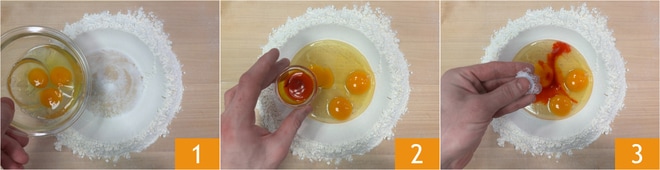 Para preparar os raviolis açafrão e ossobuco, primeiramente prepare o Caldo de carne seguindo a nossa receita. Mantenha-o aquecido e dedique-se à massa: disponha a farinha em forma de fonte e coloque no centro os ovos 1, o açafrão dissolvido em um pouco de água 2 e uma pitada de sal 3.