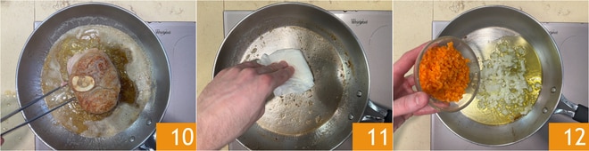 Em uma panela, derreta a manteiga com um fio de azeite. Enquanto isso, enfarinhe o ossobuco e elimine o excesso de farinha. Coloque a carne na panela e doure por 3 minutos de cada lado 10. Retire o ossobuco da panela e reserve. Limpe a mesma panela com papel toalha 11, depois adicione um fio de azeite, a cebola e a cenoura 12.