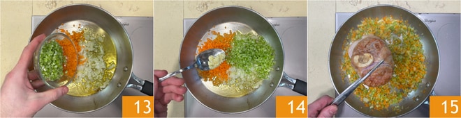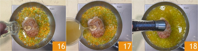 Adicione também o aipo 13 e o alho picado 14, depois refogue bem por alguns minutos. Neste ponto, coloque o ossobuco de volta na panela 15.