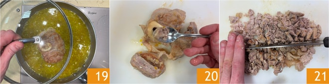 Cubra com uma tampa 19 e cozinhe por 90 minutos em fogo médio. Assim que o ossobuco estiver cozido, retire o tutano 20 e reserve em uma tigela. Separe a carne do osso e pique-a com uma faca 21.