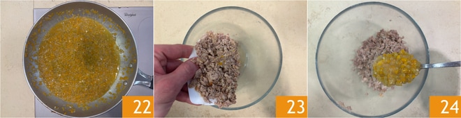 Enquanto isso, reduza o líquido de cozimento 22. Adicione ao tutano também a carne picada 23 e o líquido de cozimento reduzido 24.
