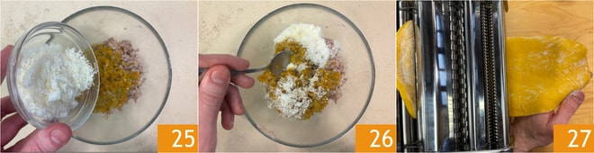 Adicione o Parmesão ralado 25 e misture 26 até obter uma mistura homogênea. Uma vez frio, transfira o recheio para um saco de confeitar e reserve. Pegue a massa e passe-a por uma máquina de abrir massa 27 até obter uma folha com cerca de 2 mm de espessura.