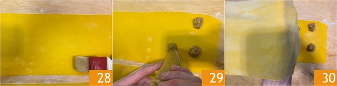 Polvilhe a bancada com um pouco de sêmola, assim será mais fácil descolar os raviolis depois de formados. Divida a folha ao meio e pincele com água uma das partes 28. Coloque pequenos montes de recheio em 2 fileiras a uma distância de cerca de 4 cm um do outro 29. Então cubra com a segunda folha 30.