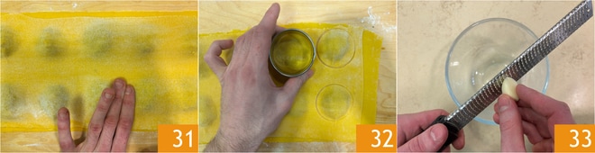 Pressione com as mãos perto do recheio para eliminar o ar 31, assim será mais difícil que eles abram durante o cozimento. Corte os raviolis com um cortador de massa com diâmetro de 9 cm 32. O restante da massa pode ser reamassado para formar outros raviolis; com essas quantidades, você obterá cerca de 22. Neste ponto, passe à preparação da gremolada: em uma tigela, rale um pedacinho de alho 33.