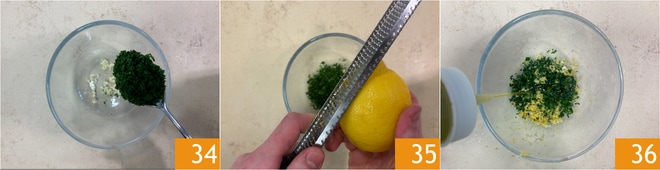 Adicione a salsa fresca picada 34, a casca de limão ralada 35 e um fio de azeite 36. Misture para combinar os ingredientes.