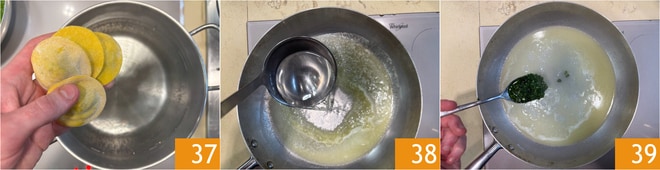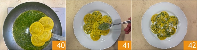 Você está pronto para cozinhar: leve uma panela com água salgada para ferver e cozinhe os raviolis por cerca de 3 minutos 37. Enquanto isso, em uma frigideira, derreta a manteiga com uma concha da água de cozimento da massa 38. Adicione parte da gremolada 39 e misture.