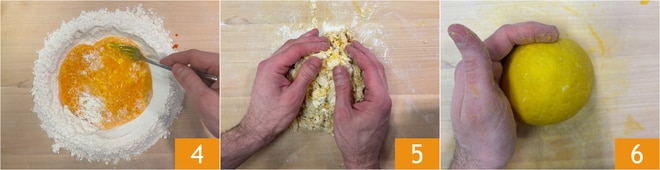Incorpore a farinha ajudando-se primeiro com um garfo 4 e depois amassando com as mãos na bancada 5 até obter uma massa lisa e homogênea 6. Cubra com filme plástico e deixe descansar na geladeira por 30 minutos.