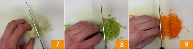 Enquanto isso, dedique-se ao recheio dos raviolis: limpe e pique finamente a cebola 7, o aipo 8 e a cenoura 9.