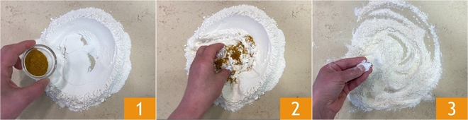 Para preparar os raviolis chineses de frango ao curry, comece pela massa: coloque a farinha em forma de monte na bancada, tempere com curry 1 e misture com os pauzinhos ou com as mãos 2, depois acrescente uma pitada de sal 3.