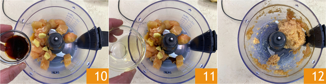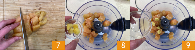 Enquanto isso, prepare o recheio: corte o peito de frango em cubos 7 e transfira para um processador. Adicione o gengibre 8 e o vinho de arroz 9.