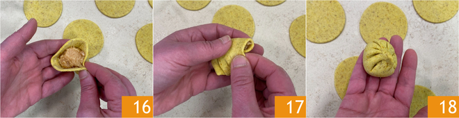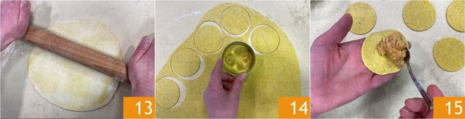 Decorrido o tempo de descanso da massa, abra-a sobre a bancada levemente enfarinhada até uma espessura de cerca de 2 mm 13. Corte discos com um cortador de 8-9 cm de diâmetro; com estas quantidades você obterá cerca de vinte 14. Pegue um disco de massa e coloque uma colherinha do recheio no centro 15.