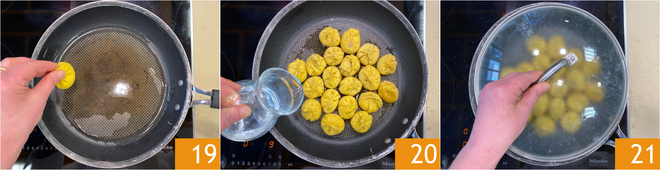 Passe para o cozimento: aqueça um fio de óleo vegetal em uma frigideira antiaderente, disponha os raviolis 19 e doure-os em fogo médio por 2 minutos. Quando a base estiver dourada, despeje a água 20 e tampe imediatamente com a tampa 21.