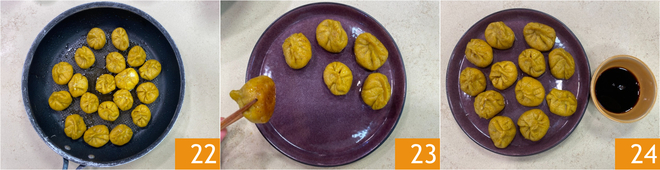 Cozinhe por cerca de 5-6 minutos. Quando a água evaporar, retire a tampa e deixe fritar por mais 30 segundos para deixar a base crocante 22. Arrume nos pratos 23 e sirva os seus raviolis chineses de frango ao curry com uma tigelinha de molho de soja 24!
